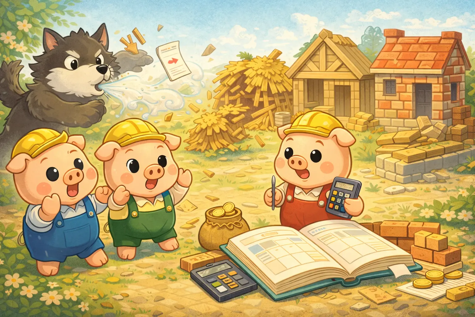 【簿記3級童話】三匹のこぶた、建設コストの真実〜オオカミと原価・減損・減価償却〜